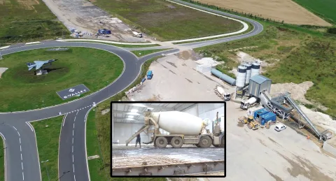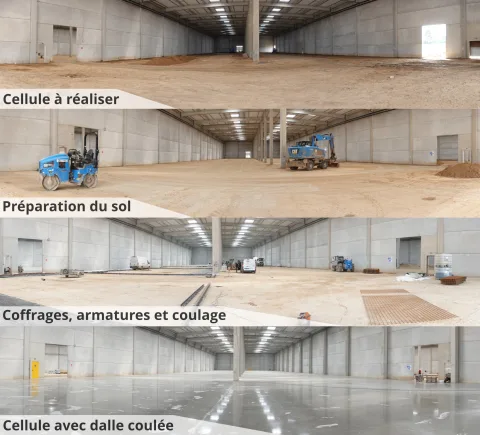 Après avoir finalisé les bâtiments G et D, l'assemblage de la charpente du bâtiment C est maintenant achevé. Notre centrale BPE, installée directement sur le chantier, continue de couler les dalles pour les deux derniers entrepôts en construction avec des cadences pouvant atteindre 500 m³ par jour.