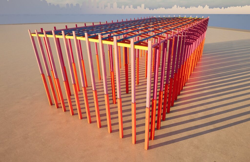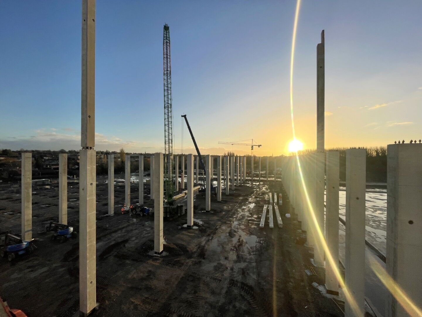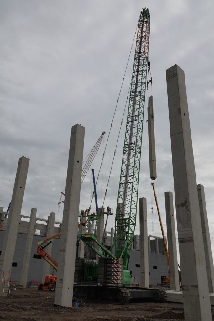 Sur ce chantier, nous mettons en œuvre une structure en béton de 33 m de haut, composée de 76 poteaux inférieurs brochés avec système Peikko (15 m) prolongés par 76 poteaux supérieurs fixés par le même système (18 m).