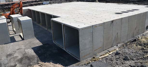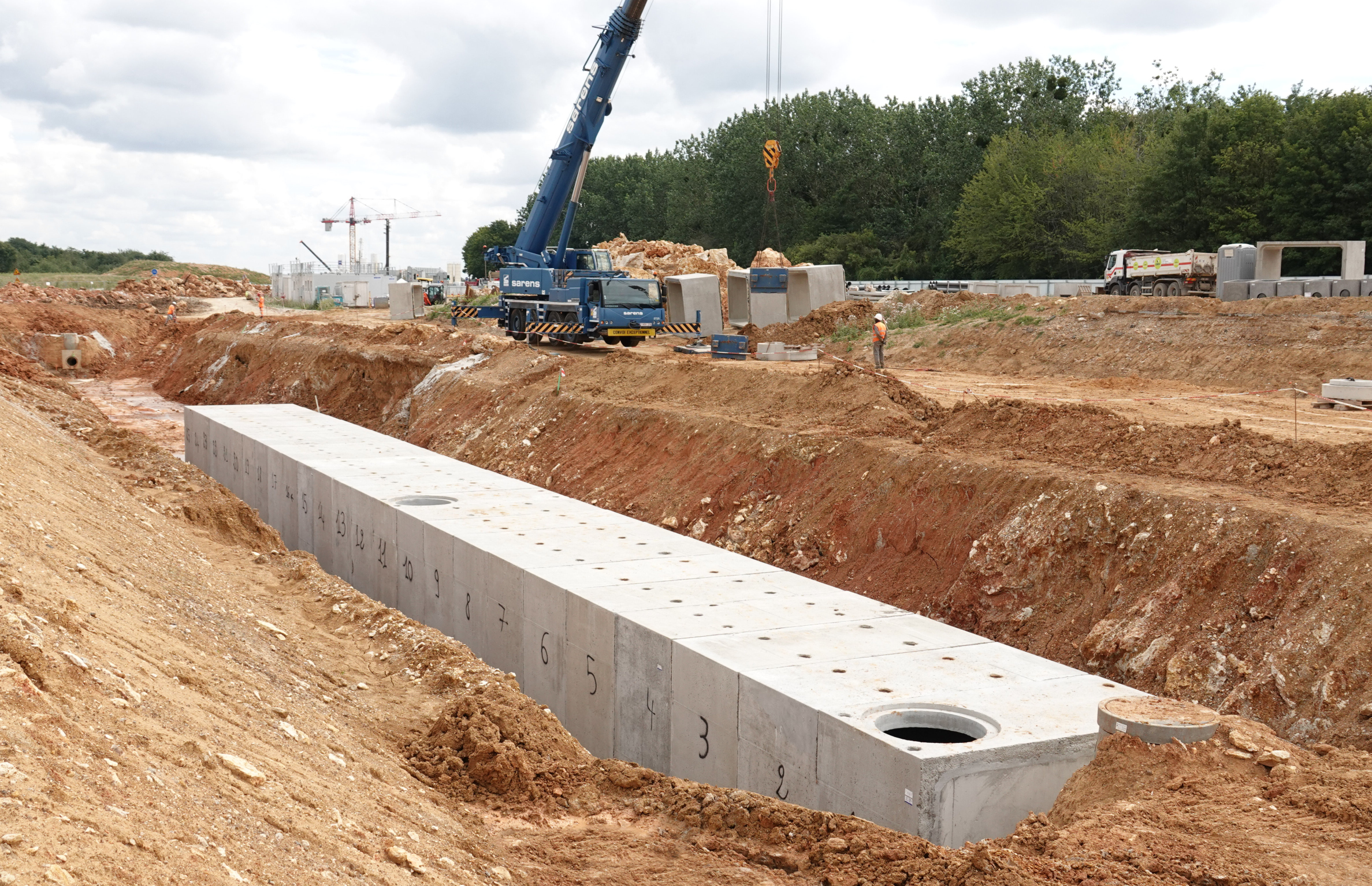 Fosses sur-mesure en pied de digue du Lac d’Orient (10). Chaque élément, proche des 4 tonnes, est composé d’un mur face digue en L avec barbacane, d’un radier et du mur opposé.
